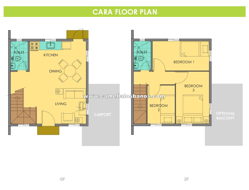 Cara has a minimum lot area of 110 sqm and a house area of 66 sqm. Cara is your practical, yet modern 2-storey house. It’s a single attached house with three bedrooms, two toilets and baths, a living area, dining area, kitchen, a carport, provision for a balcony, and a laundry and service area. At an affordable price, you can own this fully functional house and lot in Camella Los Banos in Laguna!