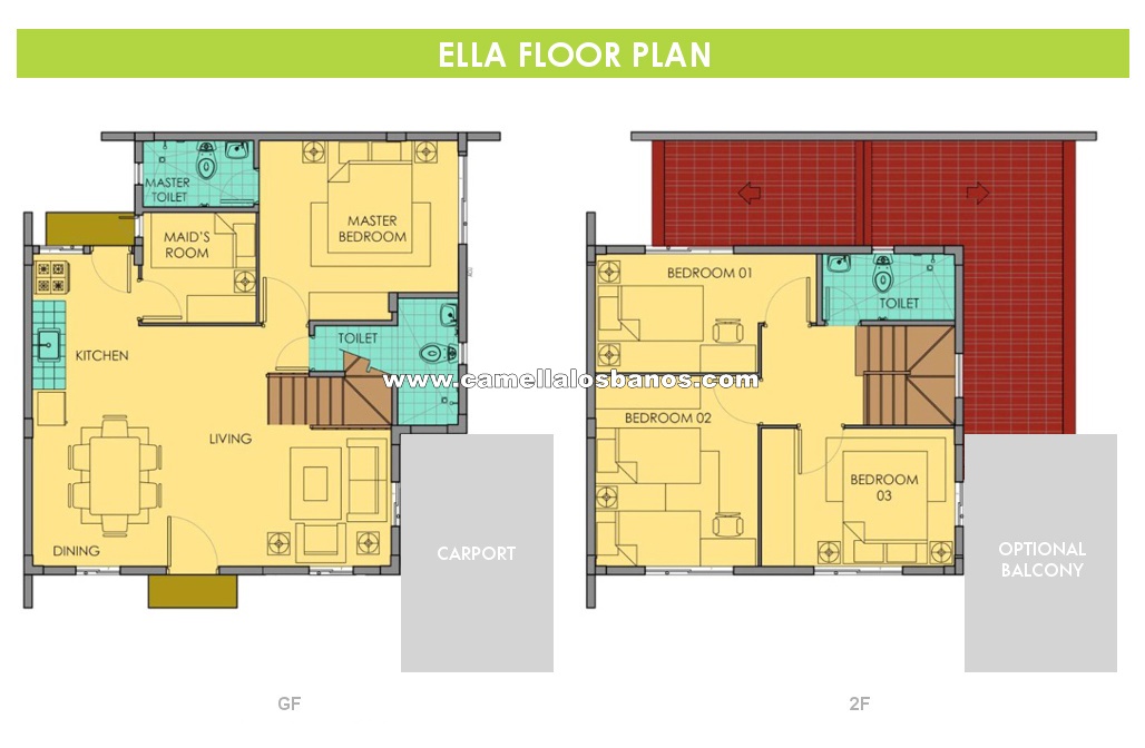 Ella has a lot area of 110 and a house area of 100 sqm. It’s a single attached 2-storey house with five bedrooms, three toilets and baths, a living area, dining area, kitchen, a carport, provision for a balcony, and a laundry and service area. The grand master’s bedroom is located at the ground floor with exclusive toilet and bathroom. If you want the biggest space and all the extra rooms that you can have, Ella model is for you!