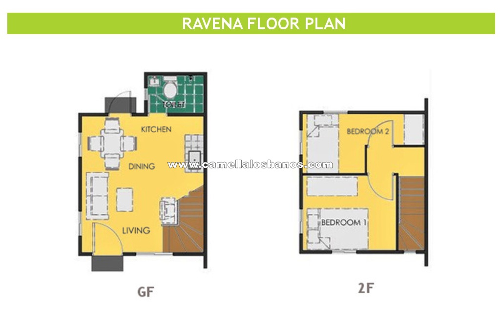 Ravena has a lot area of 44 and a house area of 40 sqm. It's a 2-storey townhouse with two bedrooms, a toilet and bath, a living area, a dining area and a kitchen.